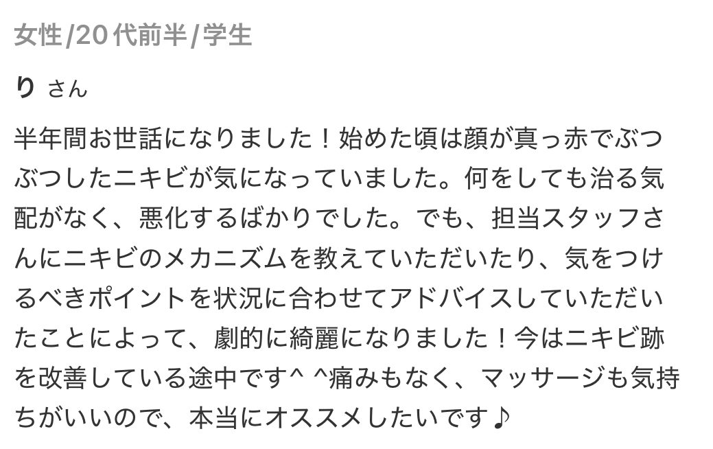 でも、担当スタッフさんにニキビのメカニズムを教えていただいたり、気をつけるべきポイントを状況に合わせてアドバイスしていただいたことによって、劇的に綺麗になりました!